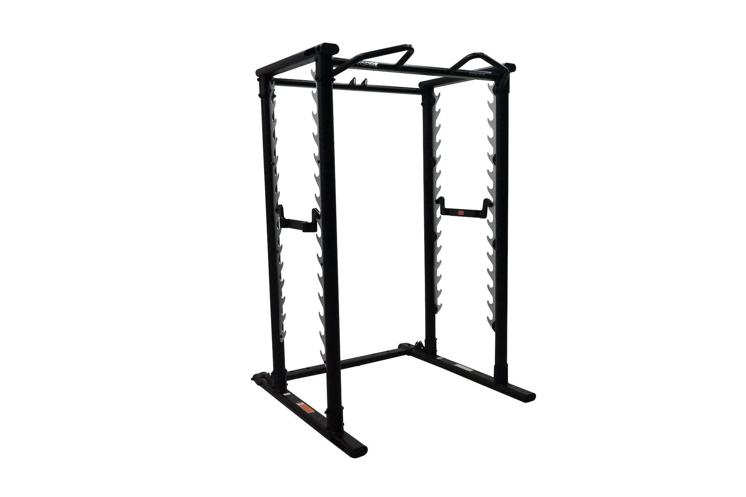 - Double racking system accommodates smith bar and free weight bar simultaneously.